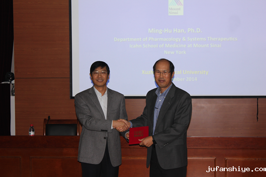 讲座上,曹君利教授介绍了韩明虎教授的简况。韩明虎教授长期从事抑郁的易感与非易感机制的研究,研究成果发表在Science、Nature、Cell、Nature neuroscience等国际权威学术期刊。郑葵阳院长向韩明虎教授颁发徐州医学院客座教授的聘书,双方表示希望今后建立长期稳定的交流与合作关系。
