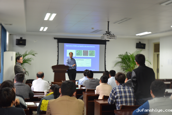 韩教授本次报告的研究成果刚于今年4月发表在Science,至今已被引用154次,引起该领域学术界广泛关注。韩教授的研究团队发现:经过社交挫败罹患抑郁症小鼠中脑腹侧被盖区多巴胺神经元上阳离子通道的电流增加,导致小鼠多巴胺神经元放电增加,从而出现了抑郁症状;而经过社交挫败未患抑郁症小鼠阳离子通道电流增加幅度是抑郁小鼠的3倍,但多巴胺神经元放电却没有增加。韩教授解释:增加的阳离子电流虽然是致病因素,但过度增强后却激活了钾通道,从而使多巴胺能神经元的放电维持在正常水平。韩明虎教授在报告中提出一种全新的治疗策略,即“把坏的机制变得更坏,使其变成好的机制,达到治疗疾病的效果”。这改变了以往“扭转致病机制”的典型治病方法的理念。韩教授的报告引起了师生们的极大兴趣,他们争相提问,韩教授一一作了解答。