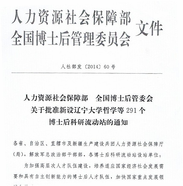 近日,按照《人力资源社会保障部 全国博士后管委会关于批准新设辽宁大学哲学等291个博士后科研流动站的通知》(人社部发〔2014〕60号)文件精神,我校生物学一级学科获准设立博士后科研流动站,对此表示祝贺!