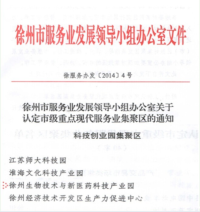 日前,徐州市服务业发展领导小组办公室下发《徐州市服务业发展领导小组办公室关于认定市级重点现代服务业聚集区的通知》(徐服务办发〔2014〕4号),我校“徐州生物技术与新医药科技产业园”获批成为市级重点现代服务业聚集区。
