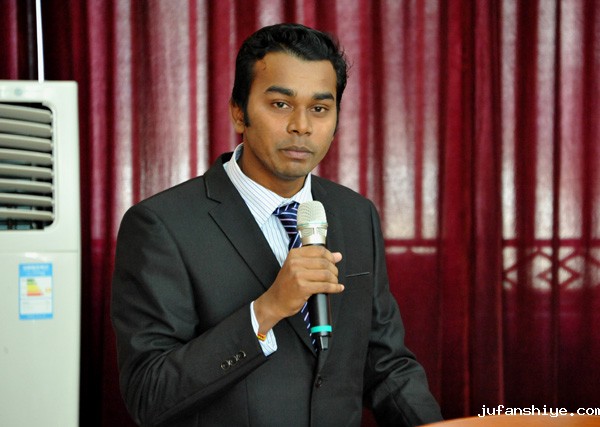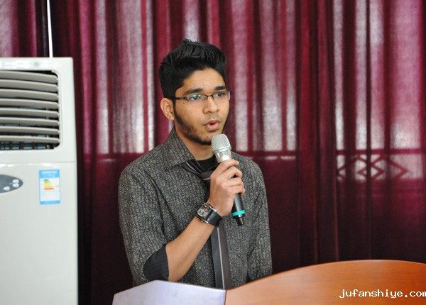 来自印度的二年级学生Abdus Samee代表老生发言。Abdus Samee获得了校一等奖学金,同时也担任班长一职。在发言中,他与新同学们分享了在我校生活和学习的经验,并鼓励新同学们在徐医勤奋学习、快乐安全地生活。来自尼泊尔的Badri Narayan Mandal作为2013级留学生新生代表发言。