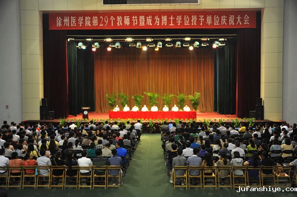 9月9日下午,我校第29个教师节暨成为博士学位授予单位庆祝大会在主校区文体活动中心隆重举行。校领导,附属连云港、淮安医院和在徐各附属医院及临床学院的主要领导、分管领导,学校教职工和学生代表约1400人参加了庆祝大会。