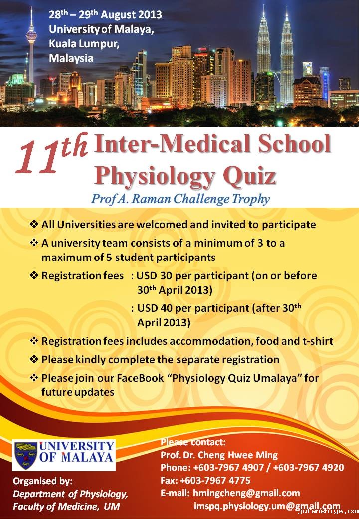 国际生理学竞赛(IMSPQ)是由马来西亚马来亚大学医学院发起的一项国际赛事。比赛不仅要求参赛学生有扎实的生理学知识,还对英语听说能力及临场发挥能力有着很高的要求。举办十余年来,已吸引了来自亚洲、大洋洲、欧洲、非洲数十个国家的近百所医学院校参与,国际影响力日益扩大。