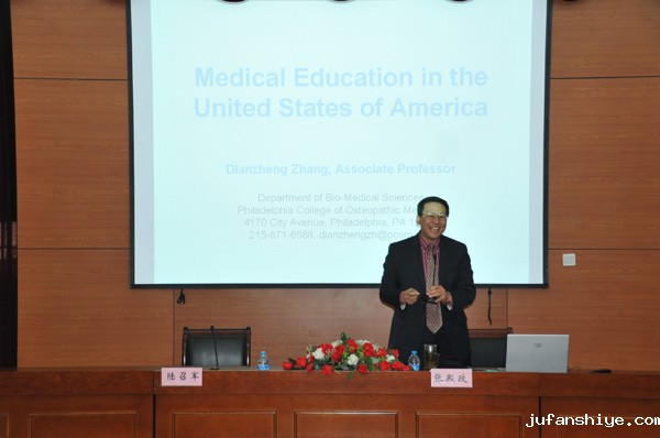 4月10日下午,张殿政博士为我校师生作了题为:“Medical Education in The United States of America”(美国医学教育)的学术报告会,教务处处长陆召军主持报告会。他结合美国医学教育实际状况,根据研究的资料与数据,介绍了美国医学教育入学门槛高,对新生选拨严格、学制较长、训练严格,因此美国的医学教育水平很高。同时他指出由于美国人口数量不断增加,未来美国医生数量短缺严重,再加上生物医学等学科的快速发展,美国医学教育也面临发展与改革的压力。