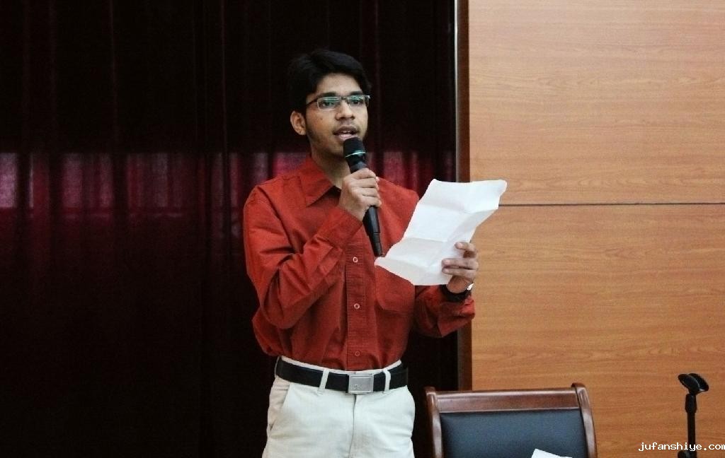 留学生研究生代表发言,表示为能够成为学校首届留学生研究生、并获得省政府茉莉花奖学金感到自豪和骄傲。他勉励在座同学,一定要乐于接受新观点、新经历和新方向,用新方法思考新问题和旧问题,在汲取知识中寻找快乐。