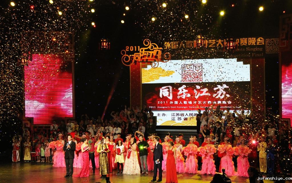 12月3日,2011“同乐江苏”外国人歌唱才艺大赛在江苏省广播电视总台演播厅精彩落幕。来自30多个国家的146名外国友人精心演绎了具有浓郁中国特色和江苏风情的歌曲,在决赛舞台上切磋艺术、共叙友谊。江苏省委宣传部部长杨新力、江苏省政府新闻办公室主任司锦泉、江苏省广播电视总台台长周莉等出席并为获奖选手颁奖。