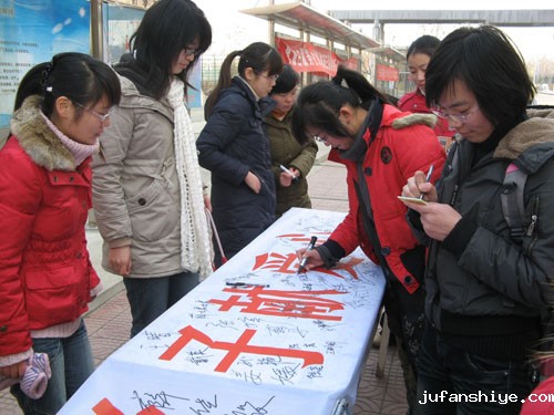 随着印有“辞旧迎新 新年之际送温暖,不分国界 徐医学子献爱心”横幅的拉出,同学们纷纷来到横幅前签上自己的名字,决心要献上自己的一份爱心。
