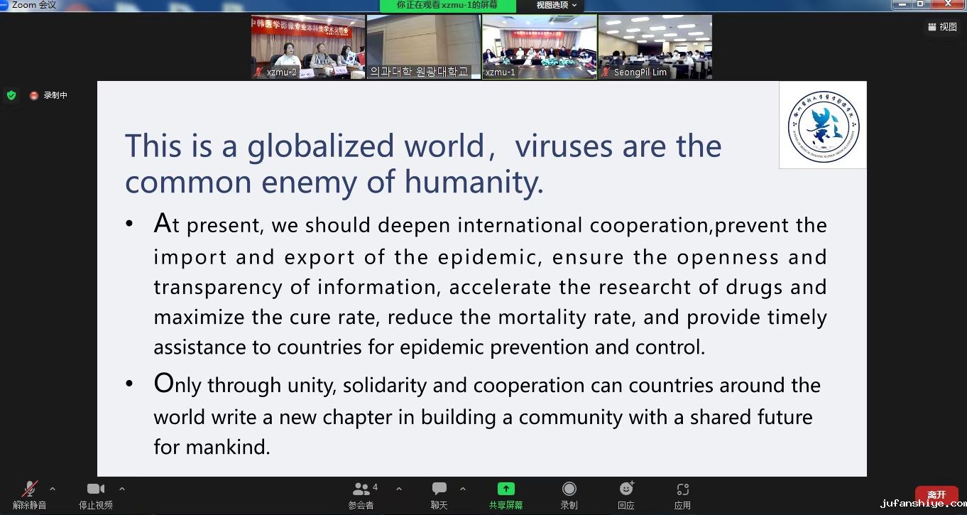 李菁菁院长和圆光大学医学院Kim Hunsoo副院长致欢迎辞,张卓琦处长回顾了近年来我校与圆光大学的合作历程,希望今后双方进一步扩大交流范围,共享合作成果,增进中韩友谊。交流会围绕“Forecast the future of COVID19(预测COVID-19的未来)”、“Genome editing: what are the ethic issues?(基因组编辑:伦理问题是什么?) ”、“How AI is changing medicine(人工智能如何改变医学)”、“AI in medicine: Positive or Negative (医学中的人工智能:有利或有弊)” 4个主题开展,双方共挑选了8名优秀本科生代表进行了主题汇报与研讨。