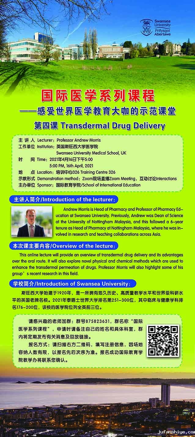 由国际教育学院主办的“国际医学系列课程——感受世界医学教育大咖的示范课堂”第4课将于4月16日下午5:00举办,邀请到英国斯旺西大学医学院的Andrew Morris教授,为师生们做示范课展示。本课的主题为:Transdermal Drug Delivery。请感兴趣的老师们查看海报并入群,扫描海报上的二维码,踊跃报名参加。因为场地容纳人数有限,在您报名后,我们将与成功报名的老师逐一联系确认。谢谢您的支持!