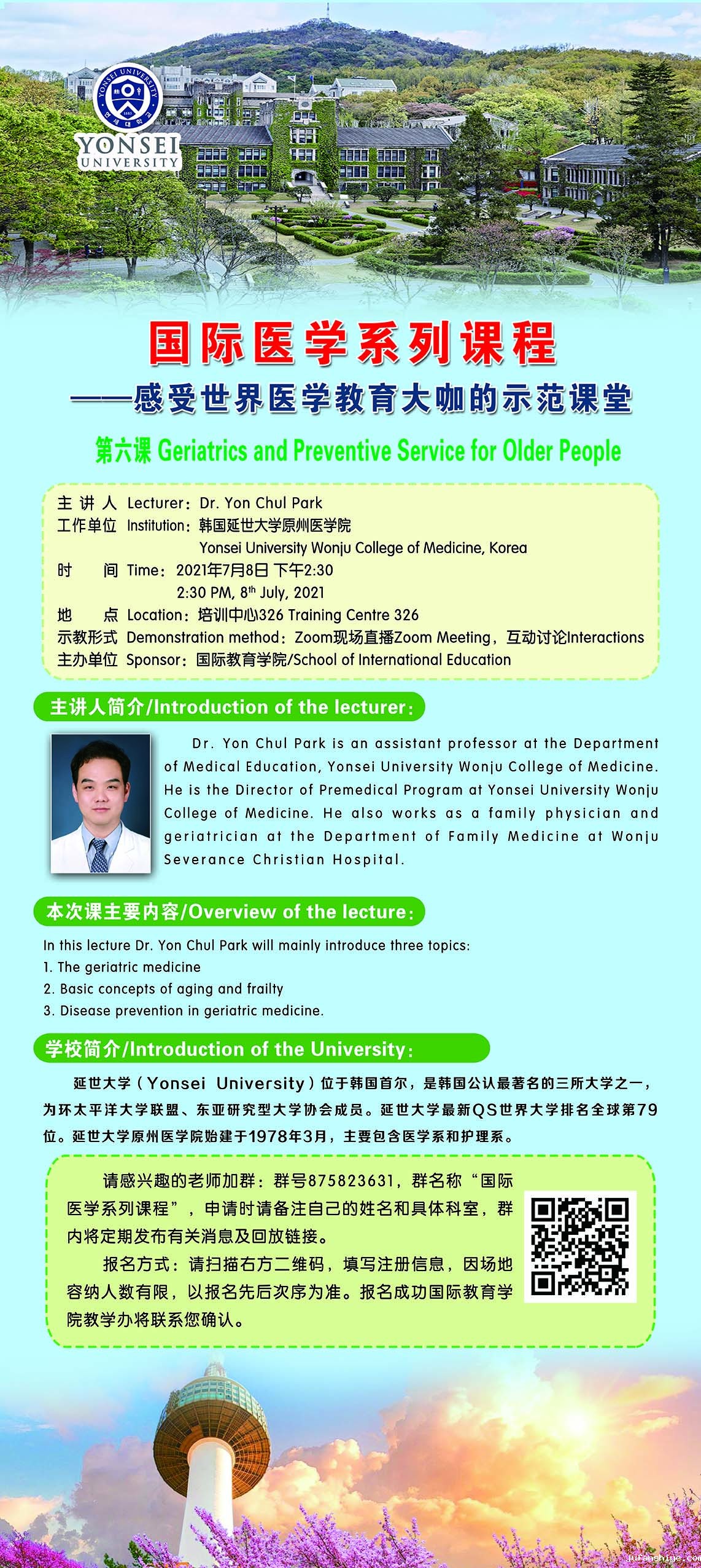 由国际教育学院主办的“国际医学系列课程——感受世界医学教育大咖的示范课堂”第6课将于7月8日下午2:30举办,邀请到韩国延世大学原州医学院的Dr. Yon Chul Park,为师生们做示范课展示。本课的主题为:Geriatrics and Preventive Service for Older People。请感兴趣的老师们查看海报并入群,扫描海报上的二维码,踊跃报名参加。因为场地容纳人数有限,在您报名后,我们将与成功报名的老师逐一联系确认。谢谢您的支持!