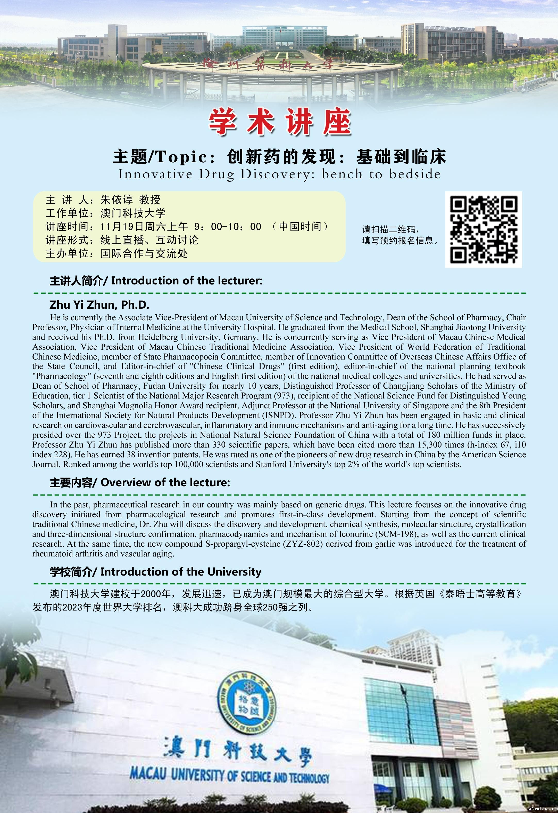为拓宽师生国际视野,扩大学术交流,加强与友好学校的交流互动,本期邀请了澳门科技大学朱依谆教授进行线上讲座。现将有关事项通知如下: